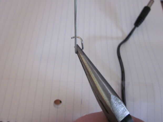 Hacer un tercer doble de manera que el cable viene dentro del círculo imaginario de la primera curva.  Esto formará el contacto de presión que empuja la parte exterior de la clavija coaxial en la horquilla formada por la primera curva.