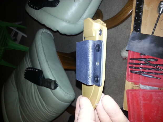 Aquí está montada sobre la vaina de Esee 3®. Espero que esto ayudó o le dio ideas sobre cómo mejorar el proceso o clips.