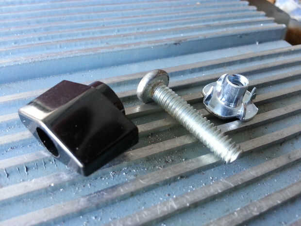 F el. 2 piezas, 1/4" hilo de rosca a través de las perillas plásticas (Home Depot $5.)