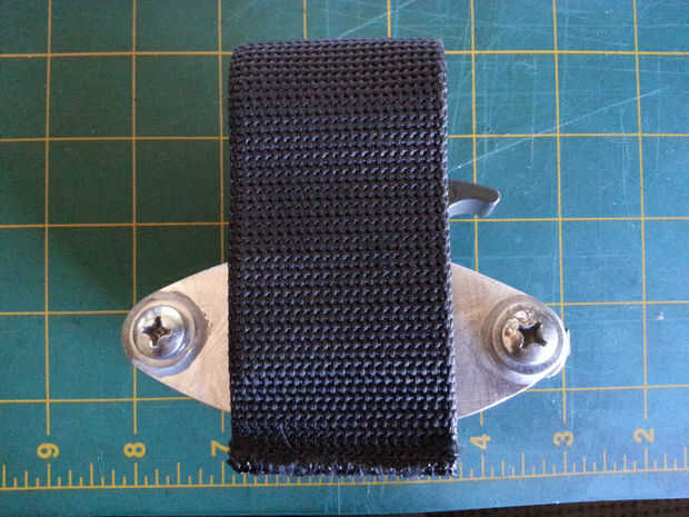 En el interior de ambas placas, cortar y pegar material de goma de 1/8" por lo que las placas apoderará de su correa correa o paquete. Usé cinta de doble palo en la mía. Cortar el material por lo que es un poco más pequeño que la forma de las placas y de los pernos de fijación para que no rocen los hilos.