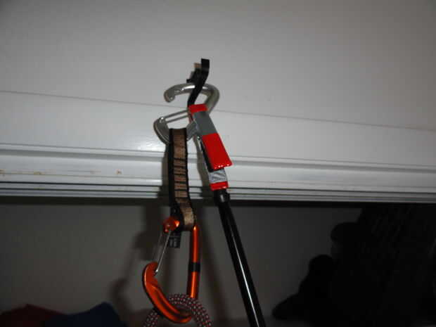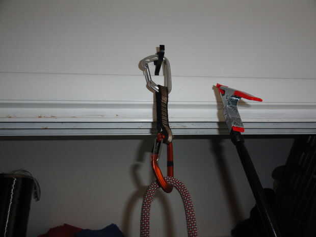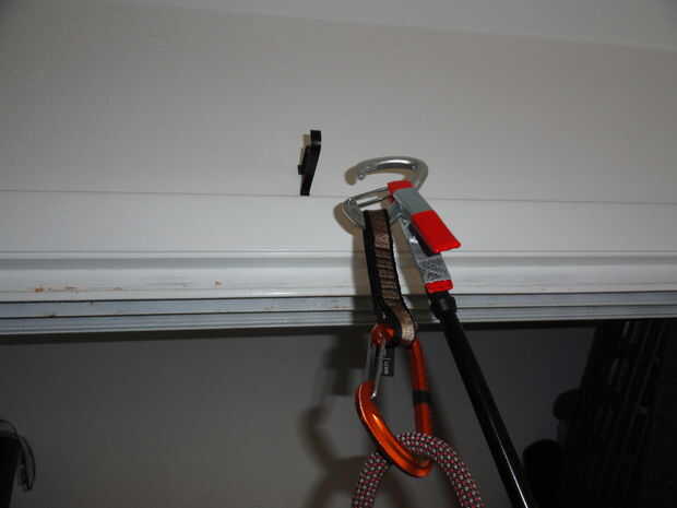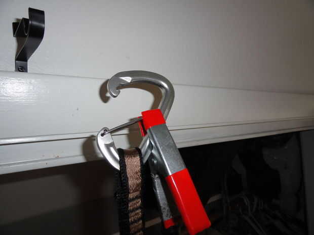 Clip de la abrazadera de resorte en el mosquetón superior asegurándose de mantener la puerta abierta con la abrazadera, así. Luego enganche la cuerda en el mosquetón inferior asegurándose de que no back-sujetarse una vez que cuelgue el sorteo. Simplemente coloque el mosquetón superior dentro de su perno (yo usé un gancho encima de mi armario para la ilustración) y tire hacia abajo.