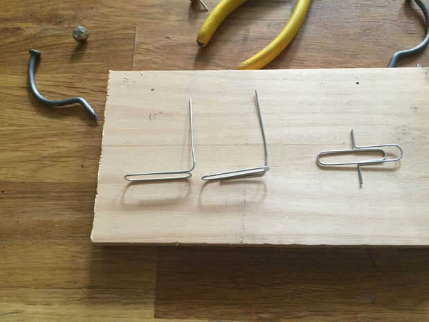 Necesita tres clips de papel Jumbo a dos soportes de forma y un rotor. Utilice unos alicates de punta y la forma como se muestra. Conseguir el rotor tan uniforme como sea posible. Es decir, encontrar el centro del clip de papel y los dos extremos de la curva a 90 grados por lo que son exactamente en el centro de los extremos del dos rotor. Usted probablemente no lo consigue en su primer intento. Eso está bien, tienes clips adicionales. Si no, robar poco más de trabajo. ;)