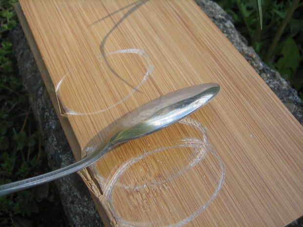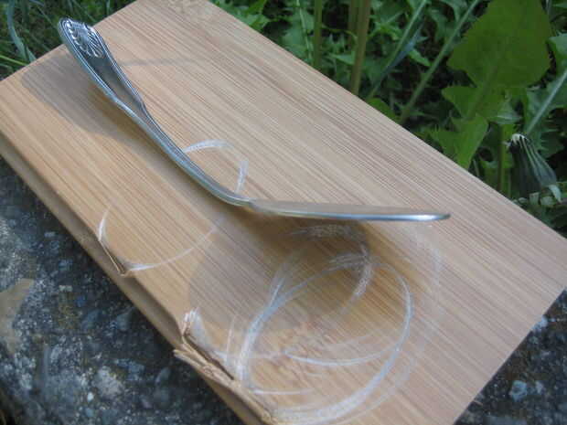 Coloque la cuchara hacia abajo en el pedazo de madera para no rayar la superficie que estás trabajando por o viceversa. La cuchara del golpe con el martillo... bastante duro. Trate de mover alrededor de la cabeza de la cuchara de medida que se avanza en cuanto a no golpear demasiado el mismo lugar. La cuchara comienza a aplanarse... seguir pasando hasta que es completamente plana. El mango empezará a doblar para arriba, no se preocupe, usted va ser doblarlo más adelante de todos modos.