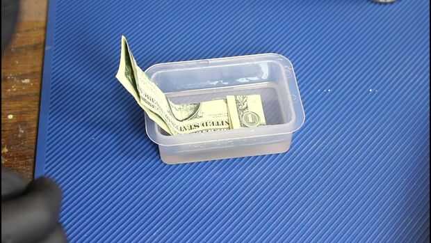 Ahora puede configurar su casting y se adhiere a la resina sin hundimiento. Simplemente dobla un dólar por la mitad, luego dobla en los extremos para que sea un clip de tamaño razonable. Desea empujarlo un poco para eliminar cualquier burbuja que podría obtener.