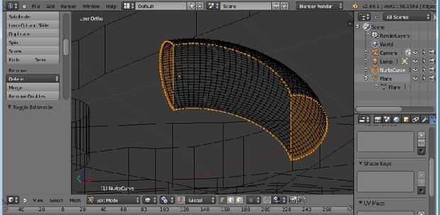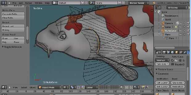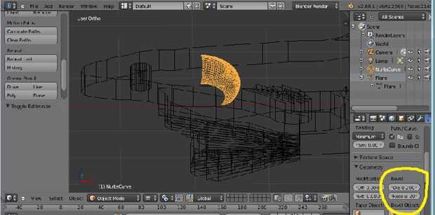 Bajo el contexto de datos de objeto NURBS curva, cambie los valores de resolución y profundidad de bisel hasta parece un gill (un círculo amarillo en la imagen). Convertir la curva en una malla (Alt + C) y cerrar todos los extremos de la curva. Únete a la malla de gill a la malla de pescado.