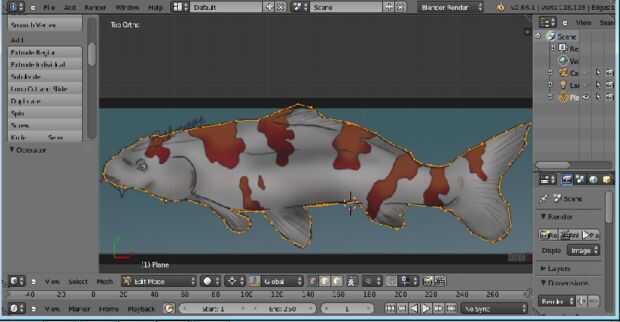 Buscar una imagen de un pez koi uncontorted en línea.  Poner esta imagen en el fondo del visor 3D en Blender.  Añadir un plano, eliminar tres de los puntos en el plano y para sacar el punto (Ctrl + botón) tantas veces como sea necesario para dibujar el contorno de los peces.  Cerrar el contorno del pescado seleccionando el primeros y últimos puntos solamente y conectarlos (F).
