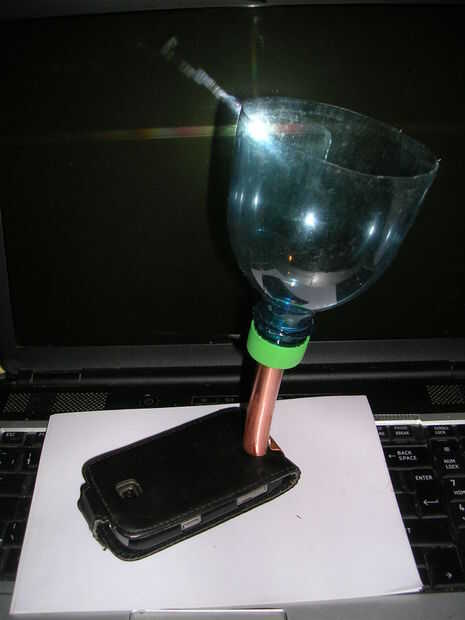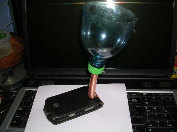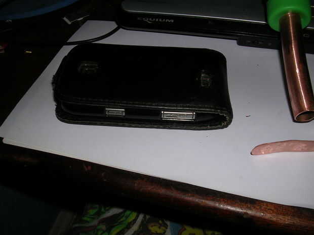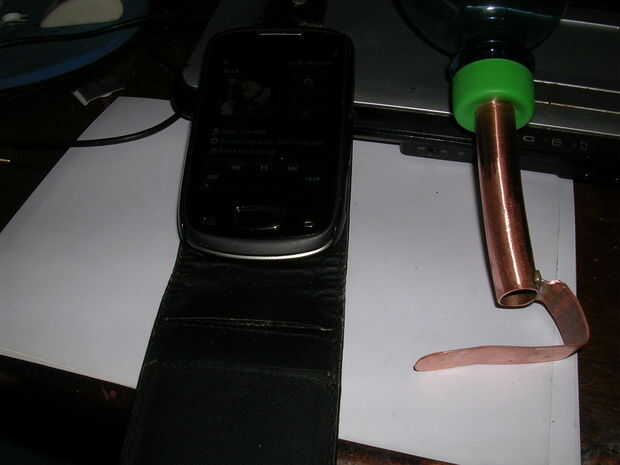 El extremo del tubo en la ranura del altavoz en el teléfono que es flatted en forma ovalada para cubrir los ratones mejor. el clip es una tira plana de cobre unos 80mm de largo y unos 20mm de ancho. He doblado a un ángulo pequeño en un extremo y lo formó para que coincida con el tubo antes de soldar las 2 piezas juntas. el clip luego se formó con los alicates para que la boca del tubo se sienta directamente sobre la ranura del altavoz en el caso.