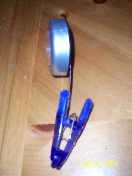 Ahora en el otro extremo de la cuña se desee propagar el pegamento dejando una separación de 3/4"(0,75") entre el borde del duende malicioso y el mango de la clavija de ropa. Simplemente presione y sujete el disco de luz de LED.