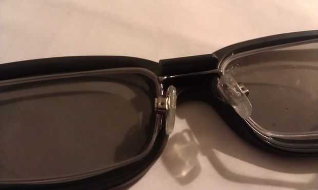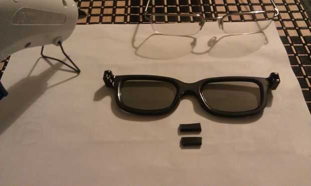 Realizar una comprobación más para asegurarse de que las gafas de receta caben fácilmente pero tanto como sea posible entre las nuevas piezas. Idealmente las gafas 3D deben quedarse si la cabeza se inclina hacia atrás ligeramente.