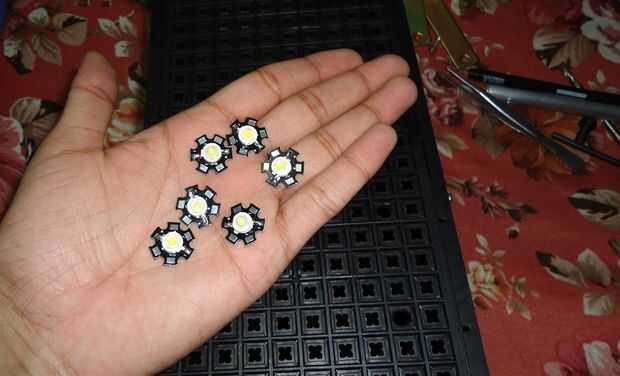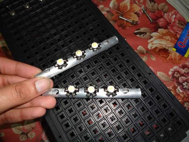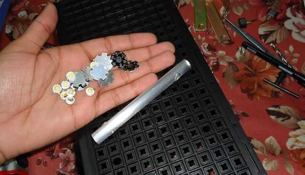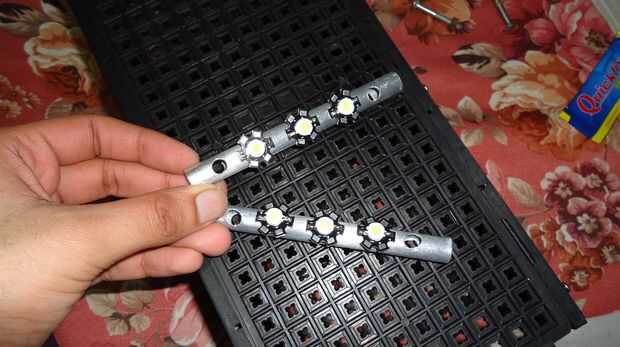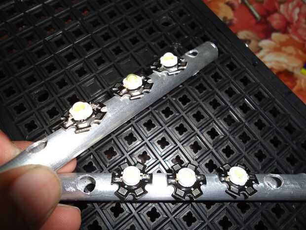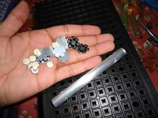 Ahora montar y soldar el LED de 1 vatio en los disipadores de calor y por último en este placas cilíndricas.