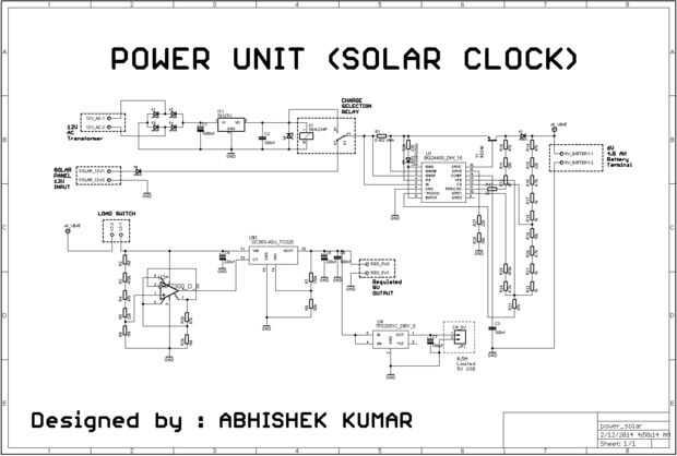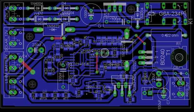 220v a 9v AC paso transformador se utiliza para obtener una fuente de carga de red 220 v AC. Este AC secundario 9V va a la entrada de la sección de rectificador de puente como se muestra en el diagrama del circuito que da vuelta en alrededor de 12v DC y alisa con un condensador de acoplamiento. Esta entrada de 12v DC opera el relé, y este 12v también va al pin normalmente abierto del relé. El contacto normalmente cerrado del relé se alimenta con 12 v entrada de los 12v, el panel solar 7W con un diodo en serie para prevenir el flujo de corriente en caso de bypass. Así en el caso de red falta de la fuente o si no desea cargar de la red, el panel solar alimenta el circuito de carga y al aplicar la corriente 220v AC, cambiará a red operado 12v DC para el circuito de carga a través del relé.