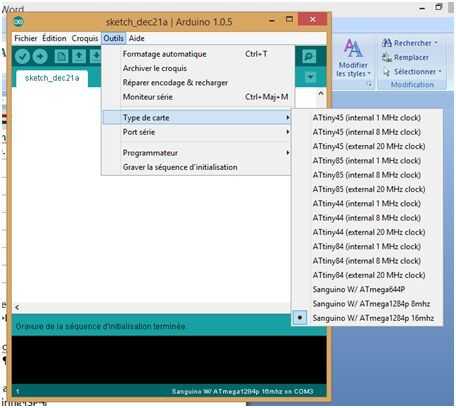 6 - Sélectionner tla cible à programador. Dans notre cas atmega644p ou p 1284 en herramientas -> Tabla -> Sanguino W/Atmega 1284 16 Mhz