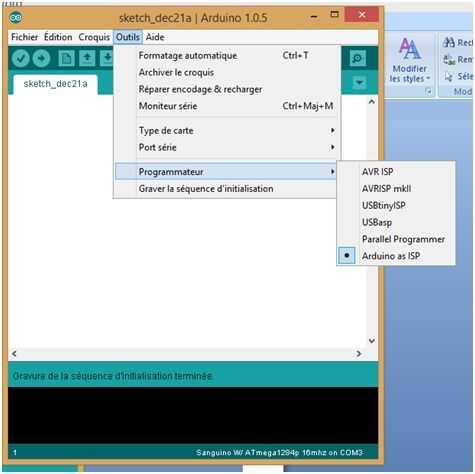 7 - menú programmateur/arduino como ISP, más grave la séquence d'initialisation (quemar Bootloader).