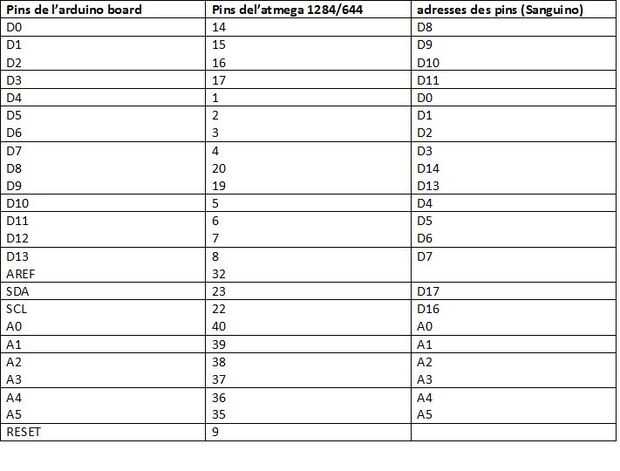 Cuadro de correspondances du posible inspiré du CALUNIUM: Arduino Uno vers atmega 644p ou 1284 p Sanguino.