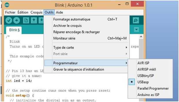 Voici maintenant le cœur de ce nous intéresse ici. Si vous avez téléchargé une versión récente de l'IDE Arduino et vous le lancez, le de vous trouverez dans menú Herramientas > programador le moyen de sélectionner le programmateur vous souhaitez signo. Vraisemblablement, pour les moins chers du marché il s'agira pour vous comme dans mon cas d ' un programmateur compatible USBasp.