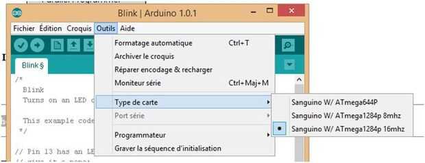 Vous devrez également sélectionner une carte utilisant le même micro-contrôleur celui vous possédez. Dans mon cas, j ' ai choisi ou de Sanguino W/atmega 644p p 1284.