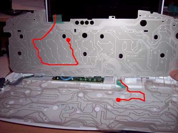 El truco es abajo los rastros para 7 llaves (14 varillas). Aunque se pueden utilizar 7 teclas de su elección, le recomiendo que traza 7 claves que están en el mismo rastro (Esto cambia el número de cables requeridos de 14 a 8). Tenga cuidado, que algunos teclados baratos le impiden presionar ciertos combinaisons de llaves, para que 2 o 3 dedos acordes no pudieran trabajar.