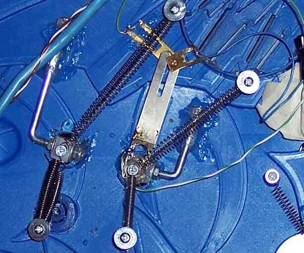 Pegamento caliente un trozo largo y fino de metal para una de las patas de la aleta. Pegue un conector debajo de la punta de la pieza de metal y otro conector por encima de él. Cuando presionando la aleta hacia abajo, se realiza una conexión. Cuando levantando la aleta, la otra conexión se realiza. (Mi segundo conector se coloca en la toma del altavoz)