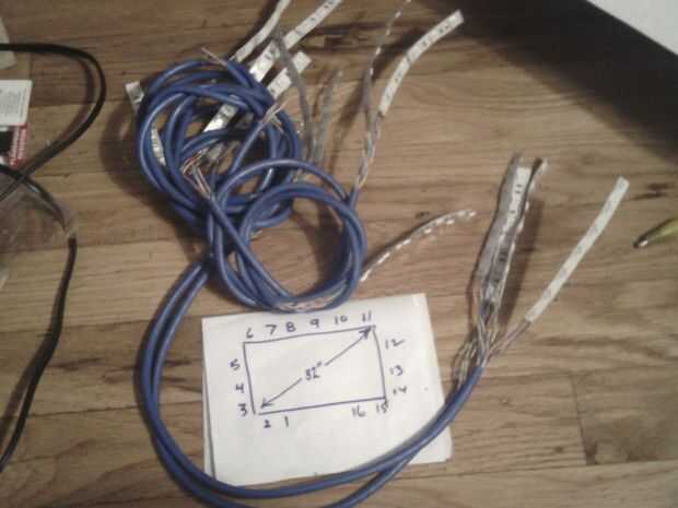 Tus franjas en los cables de la soldadura, utilizar los extremos con un par aislamiento exterior pulgadas quitó. Usted debe terminar hasta con una pila de 8 cables de 3 diferentes longitudes con LEDs soldadas de la misma manera en todos ellos. La última foto muestra completados cables de LED y un diagrama de donde montan los LEDs alrededor de la TV.