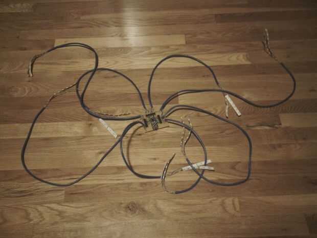 Separar y desenrolle hacia fuera los cables y ponerlos en sus nuevos grupos. Tome mi tiempo y enderezar así como pueda, porque facilita la soldadura, quiero reducir las posibilidades de mala soldadura haciendo un verdadero buen trabajo preparación de las piezas. Cuando los cables están organizados, usted necesita quitar el aislante de las puntas de los cables en ambos extremos. Como usted tira de una sección, estañar los cables antes de ir a otra sección. Sumerja los cables en flujo, luego toque brevemente contra una gota de soldadura fundida de mi hierro. La sexta foto muestra 3 cables de diferente longitud, preparados y listos para soldar