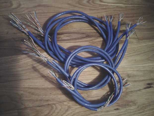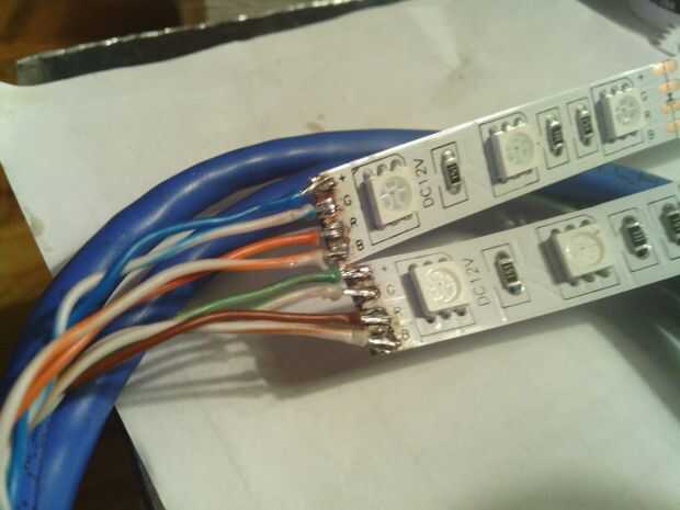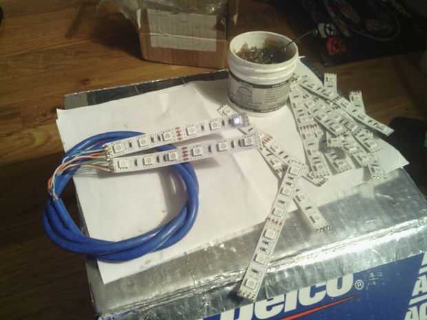 Ahora ponga el tablero y centrarse en los cables y LEDs. Mi programa de instalación utiliza 8 secciones del cable de ethernet, cada cable funciona 2 tramos de luces. Para ayudar a mantener los cables organizados, surgió un esquema de código de color de aislamiento. Pongo los pares azul/naranja para el primer canal RGB y el verde/marrón para el segundo. Los alambres sólidos de azul/verde + 12v, el verde de la tira son G, el naranja/marrón sólido R y el franja naranja/marrón son la B. naranja/azul son las zonas de número impares, y verde/marrón son las zonas de número par. Debe hacerlo sin embargo hace sentido para usted, lo importante es que los cables van en el lugar correcto, no de qué color el aislamiento.