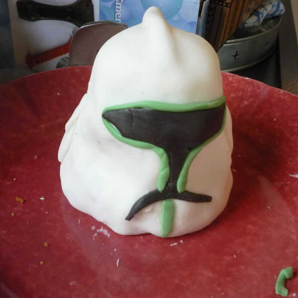 Añadir pasta de azúcar adicional a la cresta del casco si es necesario para realzar la mirada. Añadir tiras a cada lado para las áreas del oído (no tengo ni idea que llamarla!). Presione el extremo de una pajita en la parte superior de las secciones de la oreja para crear el círculo. (Ver foto 3 para ver las zonas de la oreja)
