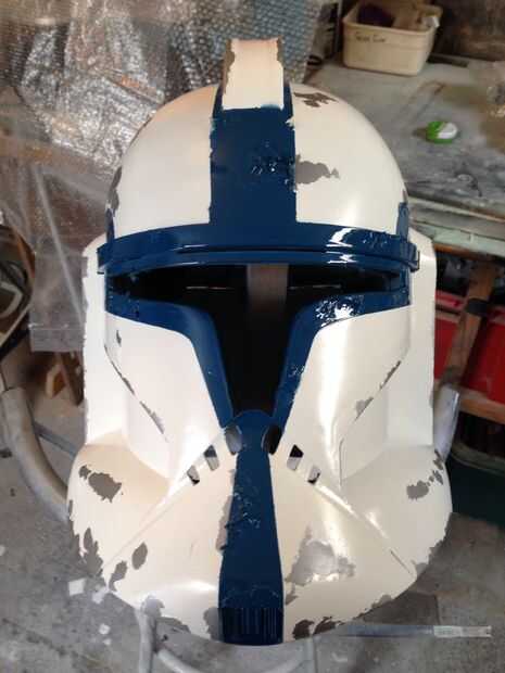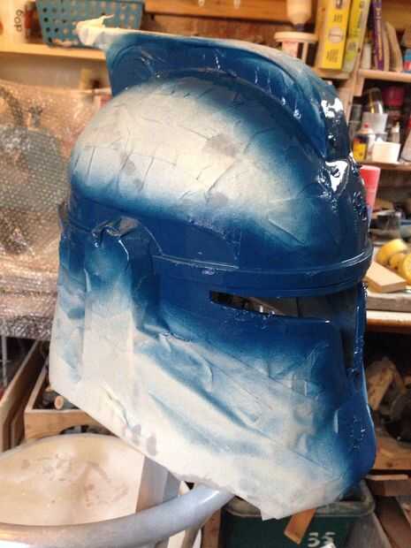 Para conseguir la cinta que enmascara la mayoría del casco con cinta adhesiva, dejando un poco pequeña en el frente y alrededor de los ojos y a través de la diversión, donde yo había grabado algunos de la plata estaba mostrando así que re hizo el truco de la Vasaline y sistema sobre mi lata de spray azul! Una vez esté todo seco, limpie otra vez.