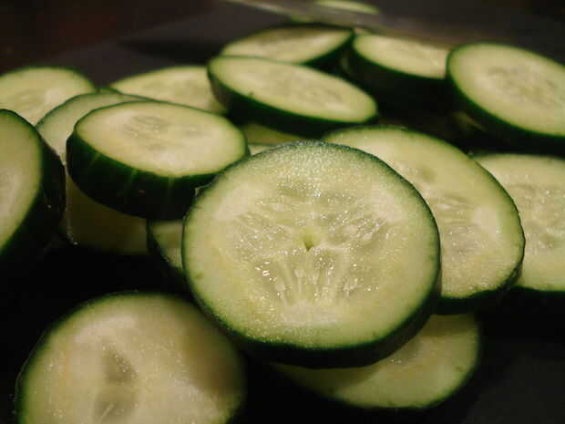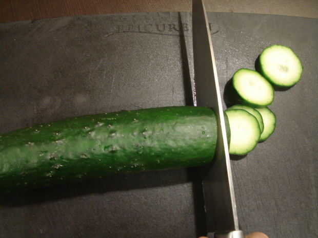 Un pepino me costo todo de 59 centavos de dólar, y era todo necesitó para un frasco de tamaño normal. Empezar por lavar el pepino. Cortar en monedas, o pruebe su suerte en la fabricación de lanzas. Prefiero cortar en sobre un cuarto de pulgada de corte, para que los encurtidos tardan menos tiempo en salmuera y sentarse fácilmente en sándwiches.