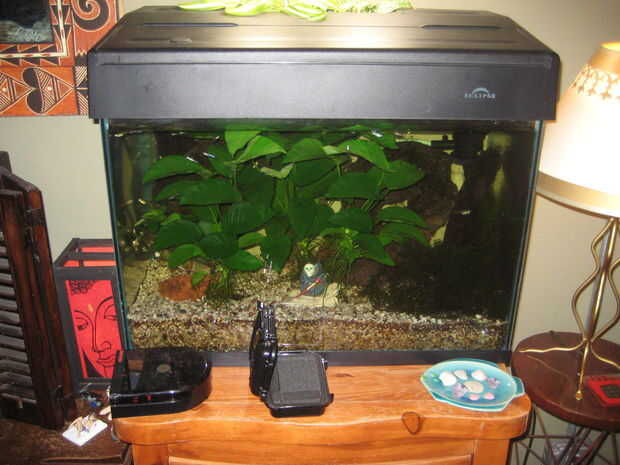 El Marineland marca Eclipse filtros son comunes "todo en uno" de filtración y sistemas de iluminación para acuarios.  Se puede encontrar usado en eBay o posiblemente en una tienda local.  También están fácilmente disponibles en línea.  Ya tenía uno en mi pecera de 20 galones y le gustó, pero no quiso seguir comprando el filtro de reemplazo del cartucho.  Así que ahora uso las plantas a mi agua potable.