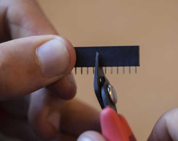 Antes de la soldadura de la placa necesita cortar las cabeceras femenino a tamaño. Tienes dos cabeceras hembra de 20 pines y necesita cortarlas en 2 conjuntos de 8 pines y 2 sets de 6 pines. Aquí está cómo: