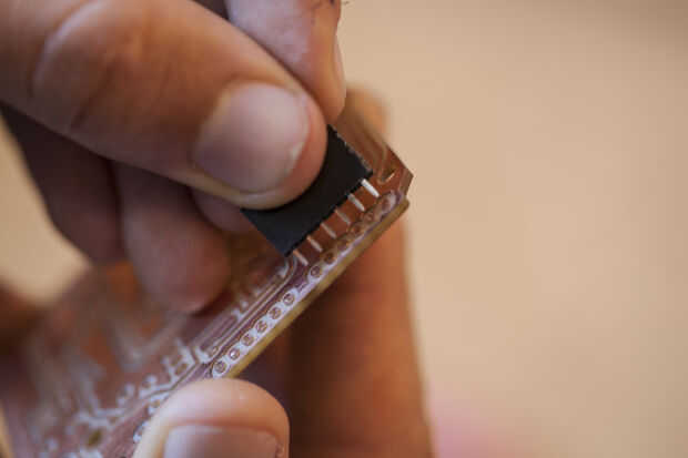 - Si estás usando ojales, solo em con pinzas y ambos extremos de la soldadura. Me gusta todos los ojales en la parte posterior de la Junta, la soldadura y luego Dale la vuelta y al otro lado de la soldadura. Para el segundo lado, asegúrese de que usted no presione las puntas de los ojales con la plancha o a empujarlos nuevamente hacia afuera. Por el contrario, pulse en la parte.