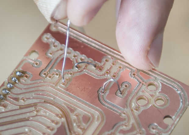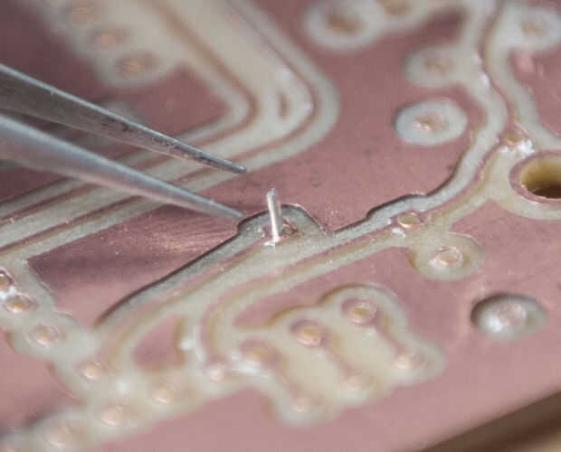 - Si no usas ollaos o alambre estañado, cortar el alambre adicional de los componentes (que es el alambre estañado técnicamente) y cortarlo en pequeños trozos. Pegar esos pedacitos en los agujeros y soldar los extremos de ambos. Puede ser un poco incómodo, pero funciona.
