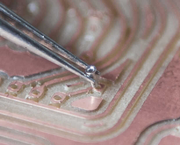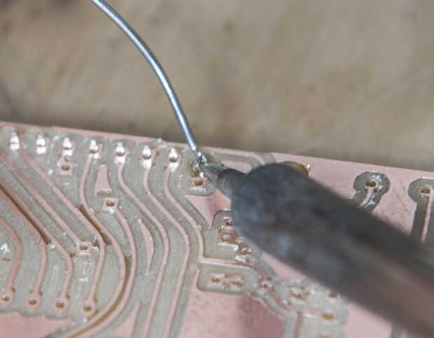 - Deberás poner algo conductora a través de cada orificio y soldadura en ambos lados de la Junta.