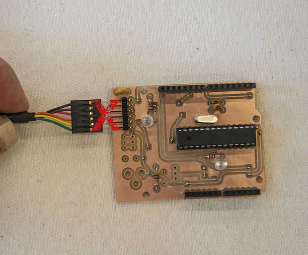 - Enchufe su cable FTDI de 6 pines, asegurándose que el lado del conector que tiene contactos metálicos hacia abajo. Enchufe el otro extremo del cable USB en el ordenador.