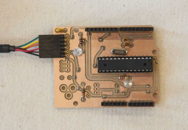 - Una vez que tienes todo soldado, inserte el chip de ATmega328P en el zócalo con la hierba pequeña apuntando hacia el borde más cercano de la Junta (como la hierba en el zócalo).