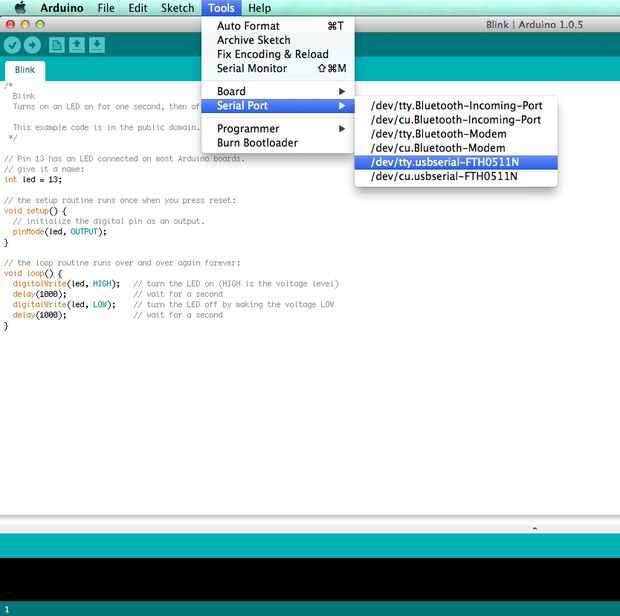 - En el menú de herramientas en Puerto serie, seleccione /dev/tty.usbserial-### (un montón de números y letras)