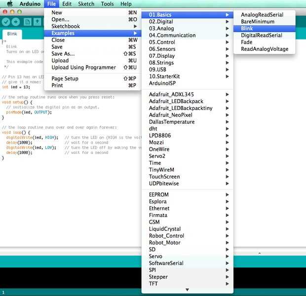 - Abierto Arduino. En el menú de archivo bajo ejemplos, abrir 01 conceptos básicos y carga el bosquejo de Blink.