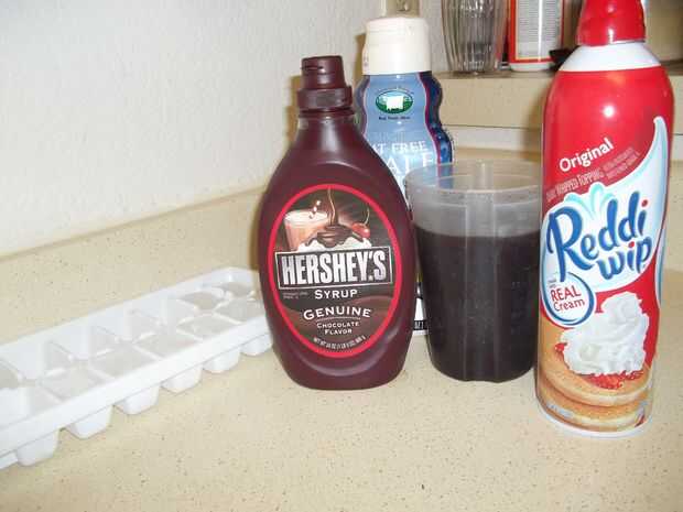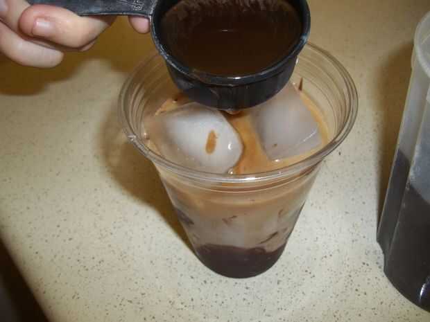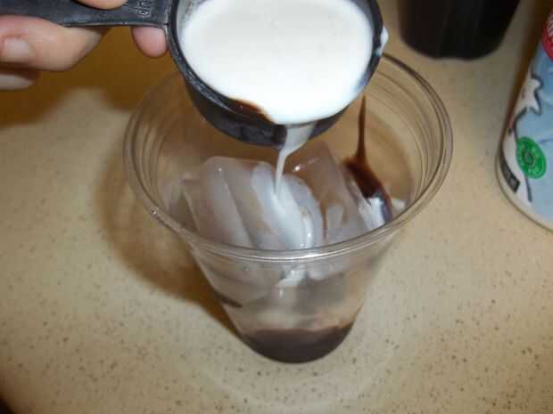 Vierta el jarabe de chocolate sobre el hielo, seguido por el café frío y crema.