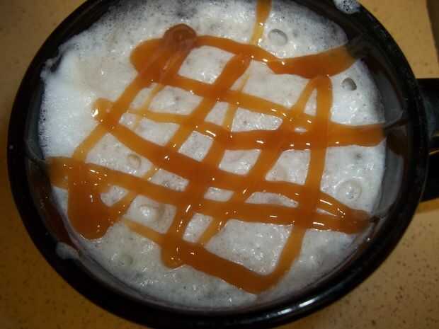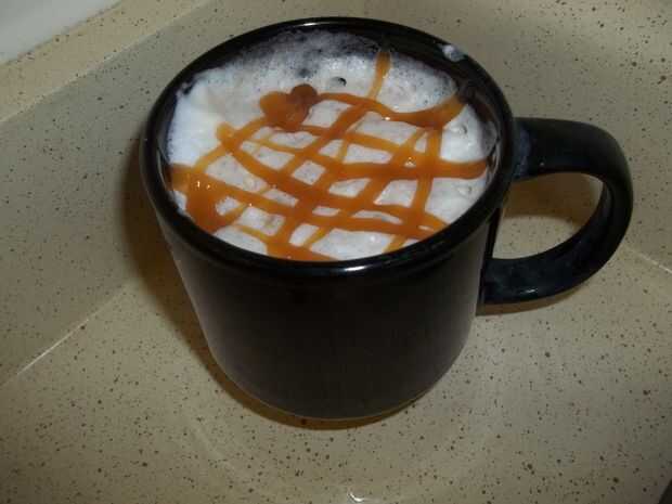 Hacer su café exprés utilizando su máquina de café espresso y vapor y espuma de la leche. En una taza grande de 16 onzas agregue el jarabe de vainilla seguido por la leche evaporada con la espuma y luego Vierta el espresso. Añadir la salsa de caramelo y mezcle bien. Superior con un chorrito de salsa de caramelo.