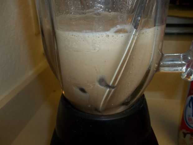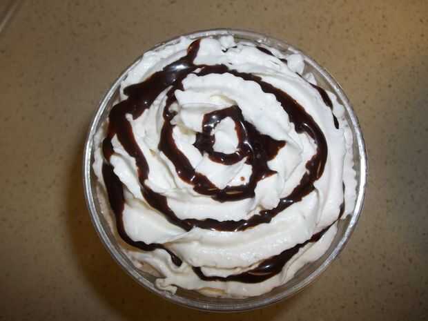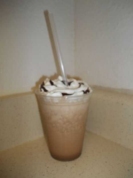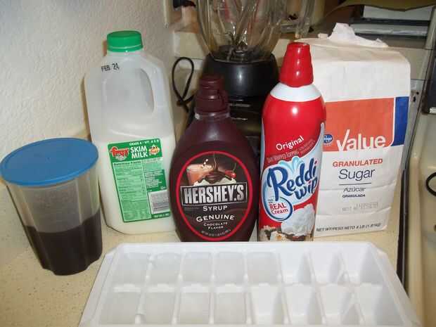 Hacer doble fuerza café colado dos veces la requerida por la cafetera de café. Almacenar el café en el refrigerador hasta que esté frío. Para hacer las bebidas, combinan el café frío, leche, jarabe de chocolate y azúcar en una licuadora. Mezcla durante 15 a 20 segundos para disolver el azúcar. Añadir el hielo y mezcla hasta que se pique el hielo y la bebida es suave. Verter en una taza de 16 onzas y top con batida y rociar con chocolate.