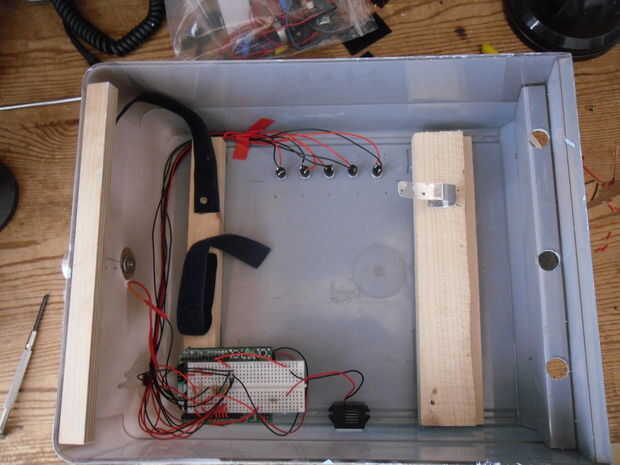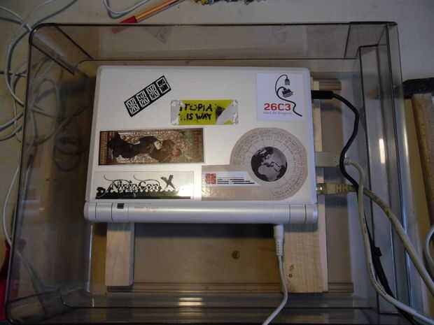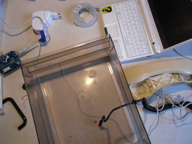 En el corazón que un eeePC 701 ejecuta un python script para administrar los tweets, festival voz Lee y un arduino maneja los botones. Código no es brillante, pero está disponible en https://github.com/themoep/cloudphone