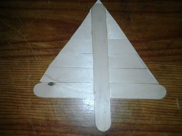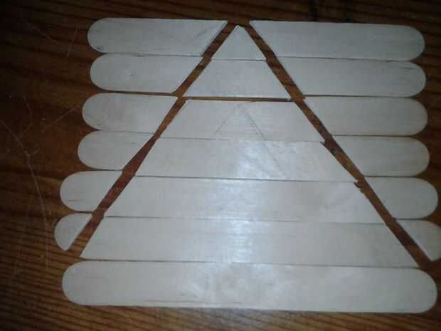 Entonces obtendrá siete o seis paletas palos (su decisión) y cortar hacia fuera en un triángulo como se muestra en la imagen para cubrir el frente de la azotea de tu club. Usted debe cortar la punta del triángulo en una medida de 80 grados. Cuando haya completado el corte de los palillos del Popsicle obtendrá otro palito y pegar las piezas sobre él a partir de la parte superior del palo de menor a mayor. Asegúrese de cubrir el palito que se se pega para que no aparezca en la punta o el triángulo y no cortar el resto, porque lo necesitará para el siguiente paso. Repita este paso dos veces para cubrir la parte delantera y trasera de su techo.