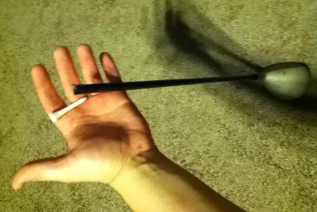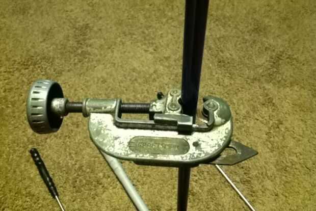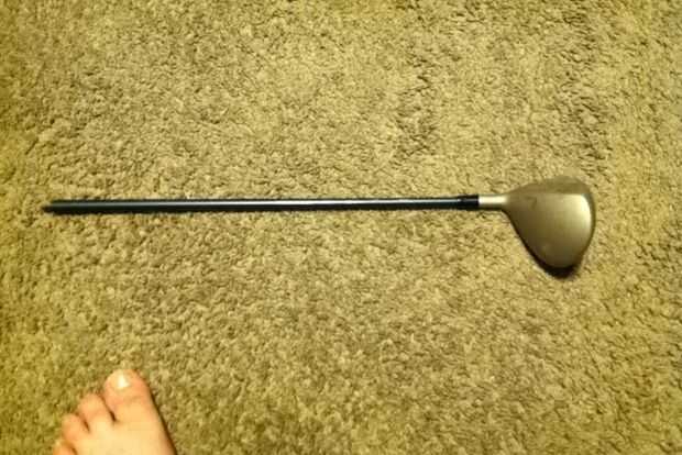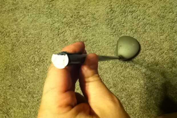 Después de hacer sus medidas, es el momento de cortar el árbol. El método más fácil para mí era usar un cortatubos, su apego un poco que al club y tenía una cuchilla radial para cortar. Puede utilizar tijeras grandes, una sierra para metales, o cualquier otra cosa que te gusta. Corte el eje y notó que era un poco irregular. La solución para esto y también la solución a un eje hueco era tomar un tee de golf y un martillo en la parte superior del eje nuevo. Esto dio un adorno bonito y seguro para el club.