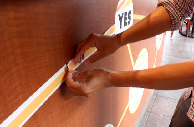 Una vez en el círculo del 'Sí' (donde hay 2 piezas de tira para llegar al próximo círculo ' 2 Haz rollitos libre '), sacar la primera pieza de tira. Pelar cuidadosamente el borde del círculo «Sí». Pelar la naranja tira el respaldo.