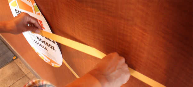 Una vez que el final se pega hacia abajo, presione suavemente la franja naranja a lo largo de la carpintería en el ángulo correcto hacia el centro del último círculo.