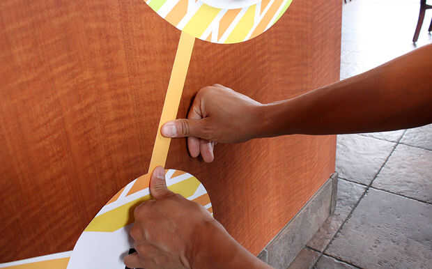 Ahora vamos a conectar los 2 círculos con la franja naranja que ya ha recortado a tamaño. Cuidadosamente Pele el forro la tira naranja y asegúrese de no doblar ni pegarse a sí mismo. Sujete cada extremo de la tira y asegúrese de que cada extremo de la tira va desde el borde más cercano del círculo hasta el borde más próximo del otro círculo. Pegue abajo el primera final en el primer círculo y presione lentamente la tira a lo largo de la carpintería en el ángulo correcto al siguiente círculo. Cualquier material exceso tira naranja se oculta bajo el otro gráfico de círculo.