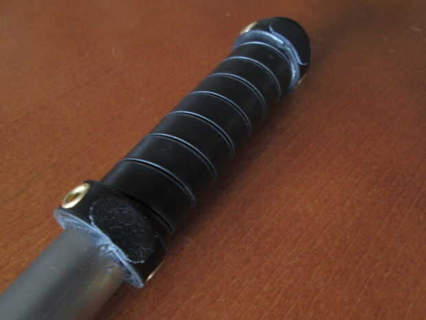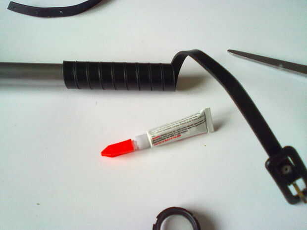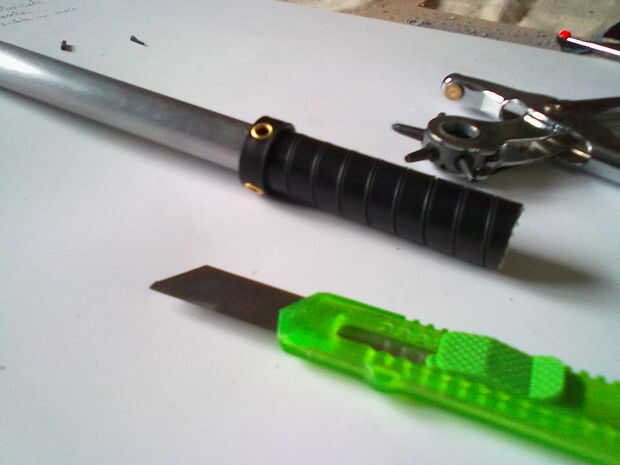 Haz un beltand cortó la hebilla, no lo vamos a necesitar. Y comenzar a envolver la cinta alrededor del tubo. Utilizar el pegamento por cada pulgada y sin costo de repuesto. Si usted está realmente pensando en usarlo como protección diaria, poner tornillos allí para asegurarse que la correa no va a caer.