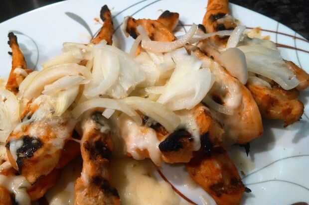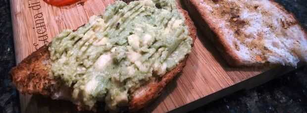 Retirar el pollo de la parrilla y coloque en el recipiente adecuado para horno, cubrir con pimienta queso y cebollas en rodajas, lugar del gato en el horno en broil alta. Tiempo de montar. Tomar la rebanada de pan y difunda en aguacate.