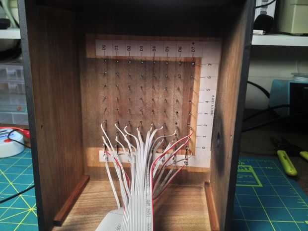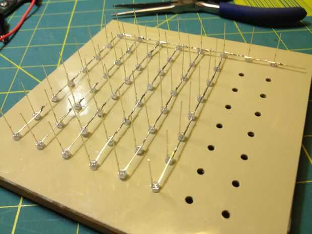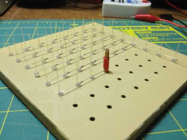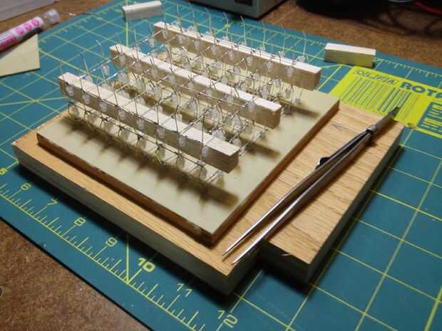 Si se construye este proyecto, que sería bien asesorado probar el LED en cada paso. Probado antes de soldar en las capas, después de cada fila, después se hizo la capa y entre las capas de soldadura juntos. Es tedioso, pero necesario operación. De los 500 + LEDs en la bolsa, he encontrado 2 que parecía perfectamente bien en el exterior, pero no enciende cuando se conecta a una fuente de energía.