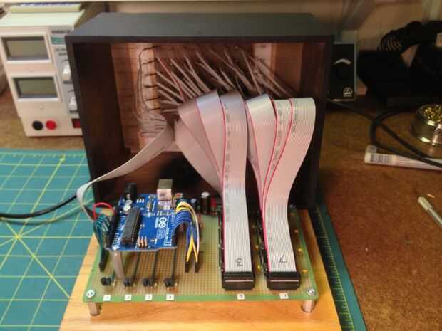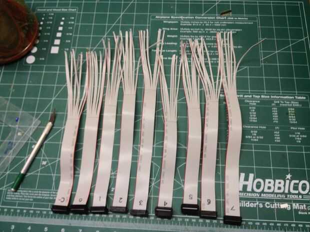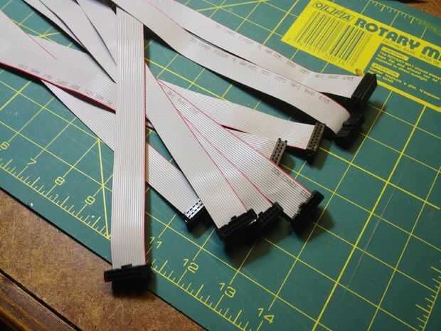 Los cables de cinta simplifica la conexión con el cubo, pero presentaron sus propios retos. Puesto que se utilizaron sólo la mitad de los conductores, las indicaciones sugieren cortando los cables no utilizados. Encontré que era mucho más fácil cortar los cables en pares a simplemente gire los dos juntos. Era demasiado fácil de corte o tire aislamiento si trataras de conseguir conductores individuales. Me pareció útil para ajustar la longitud de cada cinta para que los extremos todos terminaron aproximadamente la misma longitud cuando se dobla dentro del recinto. Por último, debido a la caja se me ocurrió, que los extremos del cable en los LEDs de largo suficiente para soldarlos era demasiado frustrante. Superé este por prensar algunos pins hembra en los extremos de los cables y luego soldar en su lugar una vez que se fijen dentro de la caja. Nuevo, marca, probar, comprobar (¡ hasta lo!)